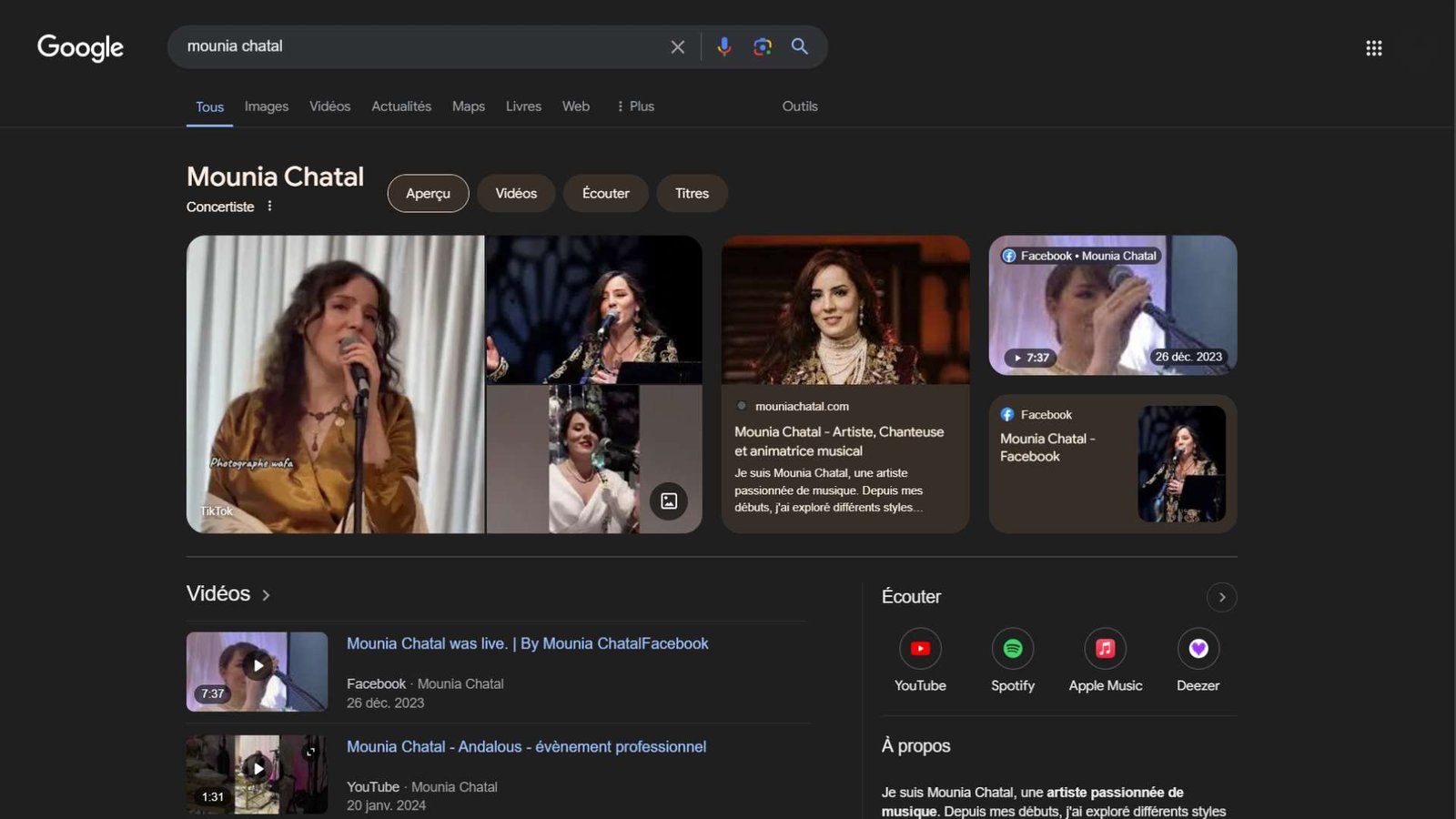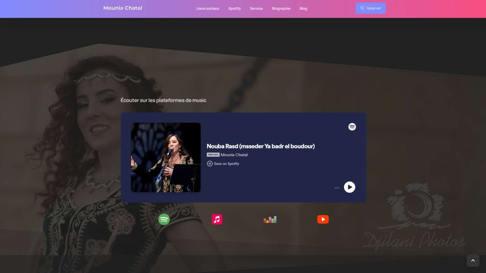 Artiste mouniachatal.com Le site met en avant ses services de prestation artistique lors des mariages, incluant des informations détaillées sur ses performances et son répertoire.